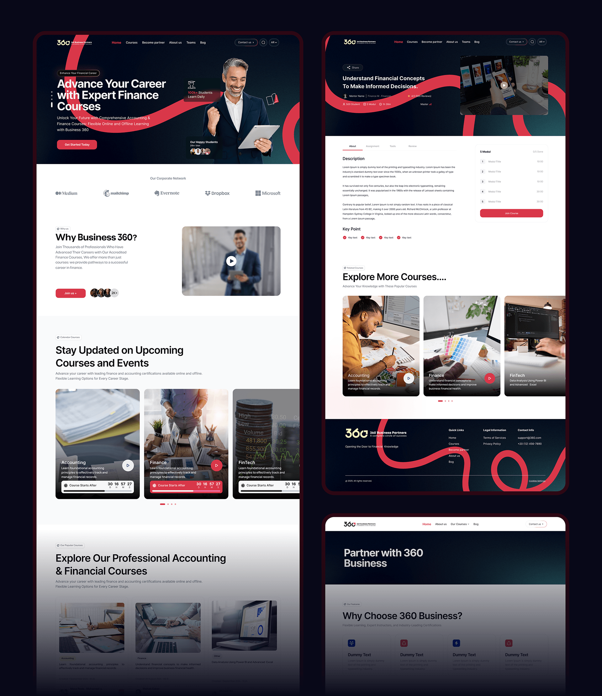 المشروع عبارة عن منصّة تعليمية حديثة متخصصة في تقديم برامج تدريبية وشهادات مهنية في مجالات الإدارة المالية والقيادة. المنصّة توفّر كورسات CMA مع خيارات مرنة للتعلّم أونلاين أو حضورياً، وبتعتمد على تصميم عصري يبرز الهوية الاحترافية ويجذب فئة المستهدفين من المهنيين الطموحين.